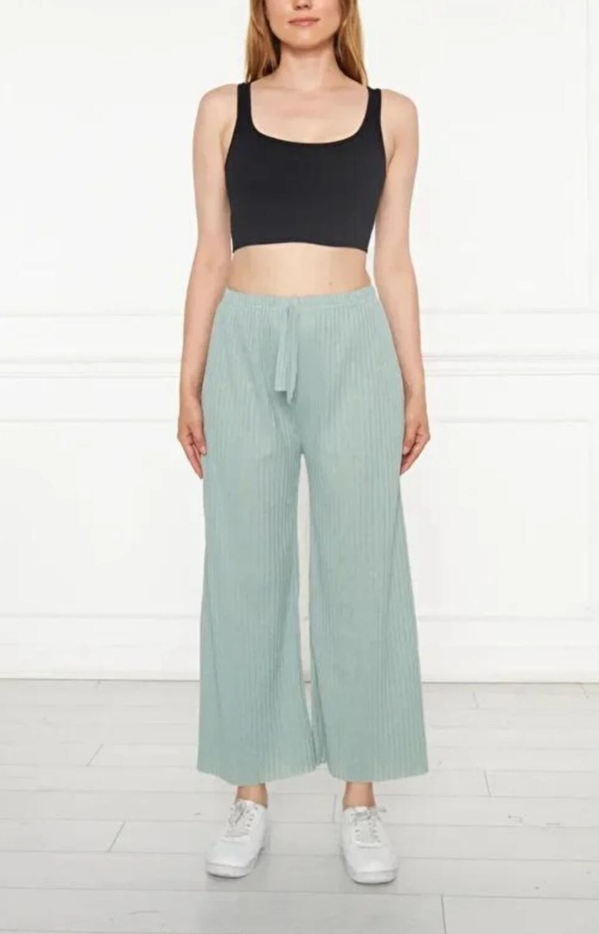 Κατασκευασμένο από βαμβακερό ύφασμα με ριπ υφή, προσφέρει δροσερή και ευχάριστη αίσθηση στο σώμα. Η φαρδιά γραμμή και η ελαστική μέση χαρίζουν άνεση και ευελιξία στην κίνηση, ενώ το διακριτικό βεραμάν χρώμα το κάνει εύκολο στους συνδυασμούς.
