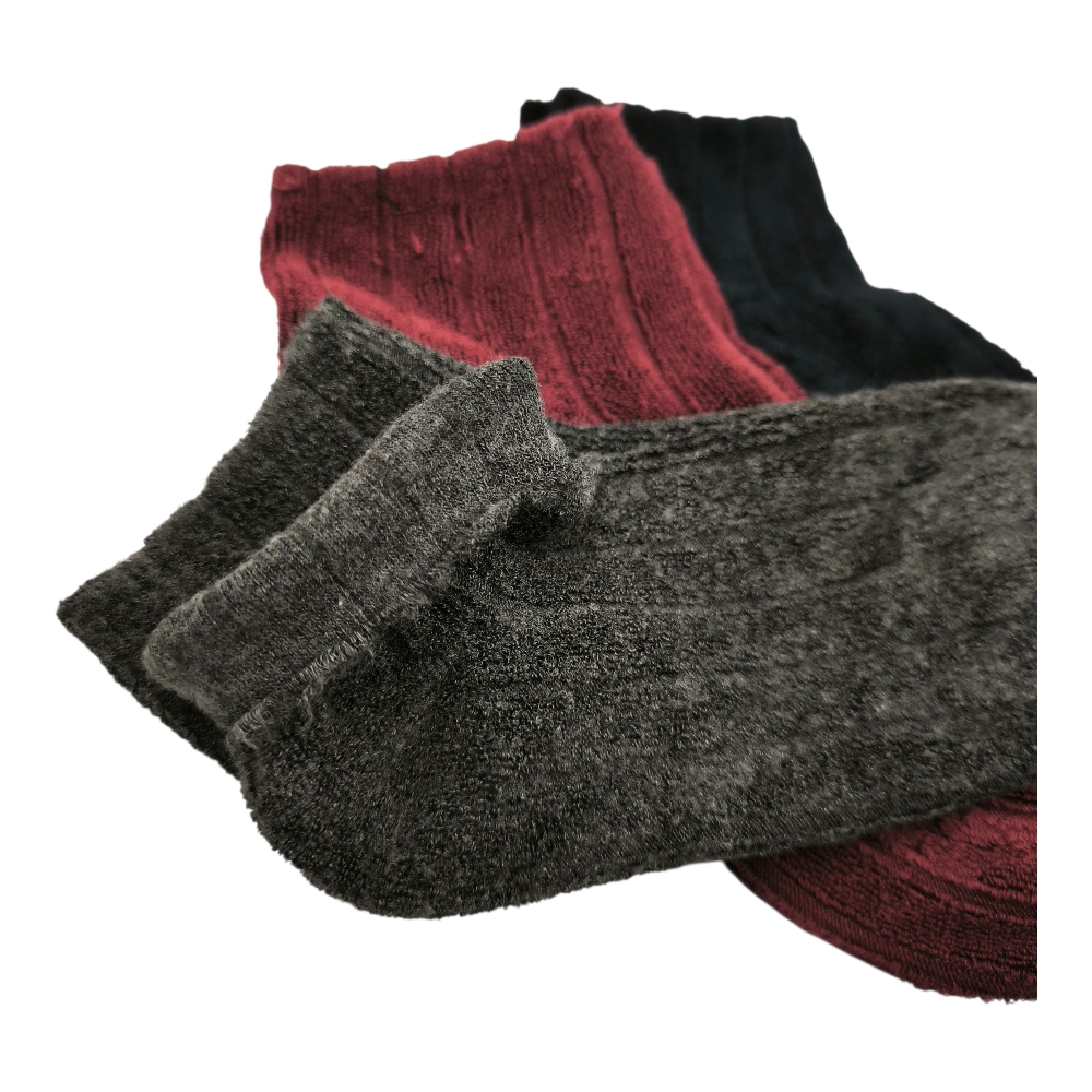 Το σετ περιλαμβάνει τρία κλασικά και ευκολοσυνδύαστα χρώματα – γκρι, μπορντό και μαύρο – που ταιριάζουν σε κάθε στυλ. Η ελαστική εφαρμογή τους εξασφαλίζει άνετη χρήση χωρίς να πιέζουν, ενώ το χνουδωτό εσωτερικό διατηρεί τα πόδια ζεστά τις κρύες ημέρες. Δεν διαθέτουν λάστιχο για άνετη εφαρμογή χωρίς να πιέζουν το πόδι.