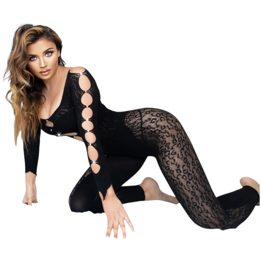 Ελαστική ολόσωμη φόρμα από δίχτυ, διαθέτει ανοιγματα μπροστά με στρας. Είναι διαφανής και μπορεί να συνδυαστεί με εσώρουχα από μέσα ή να φορεθεί σκέτη.